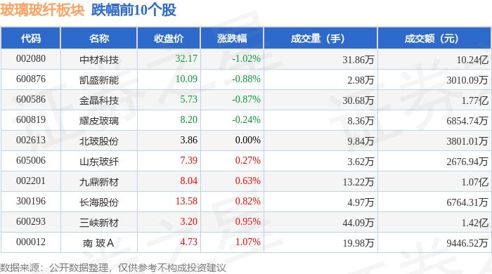 证券之星消息,12月1日玻璃玻纤板块较上一交易日上涨2.03%,中国巨石领涨。当日上证指数报收于3914.01,上涨0.65%。深证成指报收于13146.72,上涨1.25%。玻璃玻纤板块个股涨跌见下表: