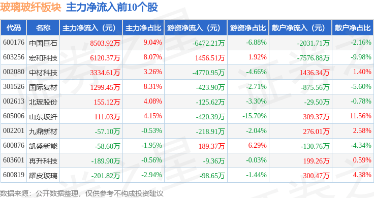 从资金流向上来看,当日玻璃玻纤板块主力资金净流入1.19亿元,游资资金净流出1.25亿元,散户资金净流入592.69万元。玻璃玻纤板块个股资金流向见下表: