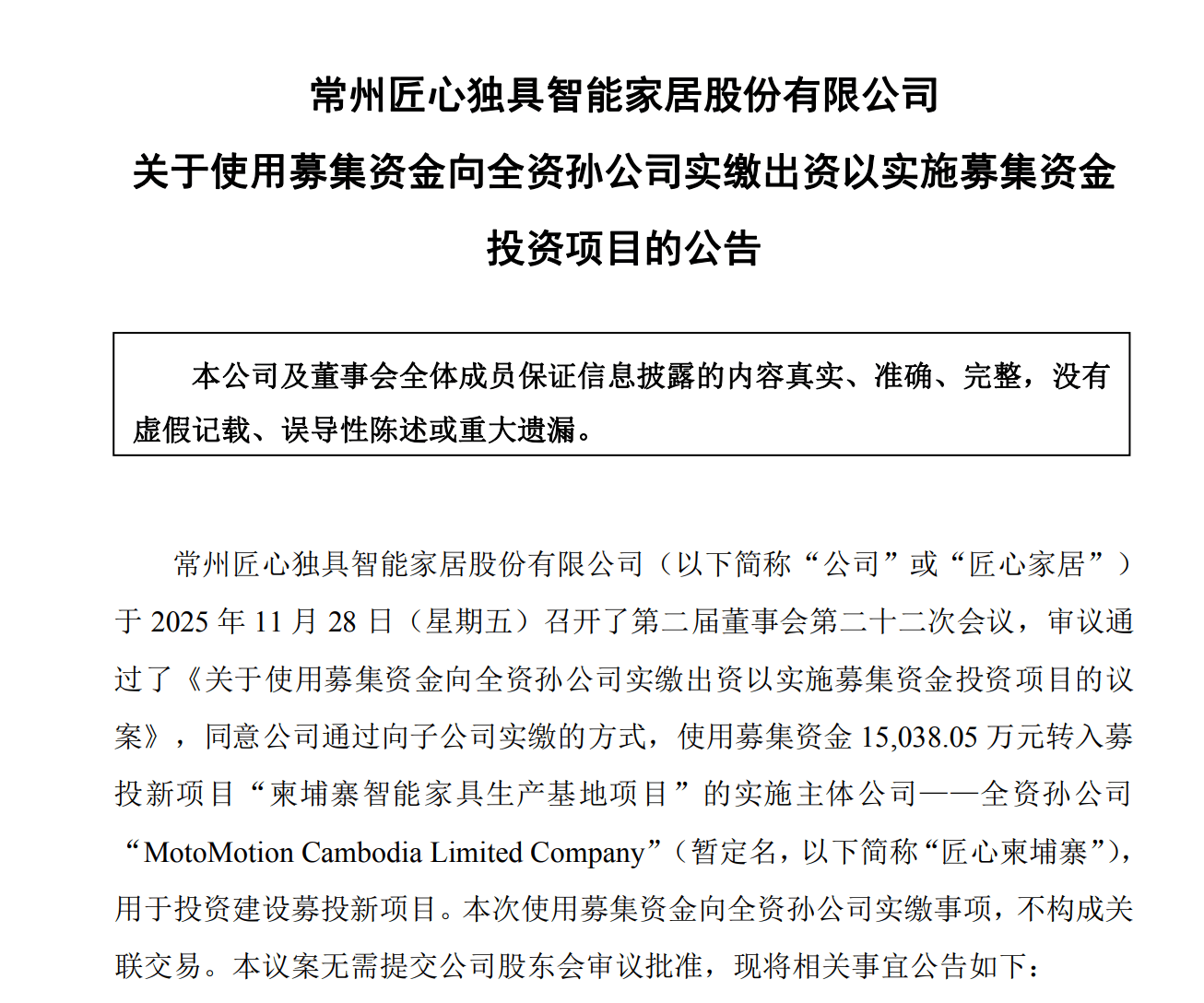 近日,匠心家居公告,公司拟使用首次公开发行股票的募集资金15038.05万元,通过在香港设立全资子公司“MotoMotion International Holdings Limited”(暂定名),最终在柬埔寨设立全资孙公司“MotoMotion Cambodia Limited Company”(暂定名)建设“柬埔寨智能家具生产基地项目”。该项目资金来源为募集资金,以现金方式出资。