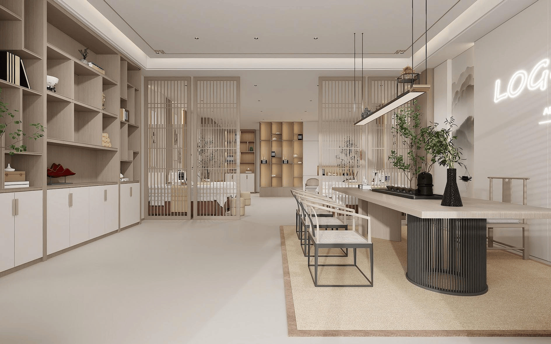 - 过道两侧可摆放小型绿植或禅意摆件(如石臼、陶罐),每隔一段距离设置磨砂玻璃屏风做视觉隔断,延长空间纵深感。