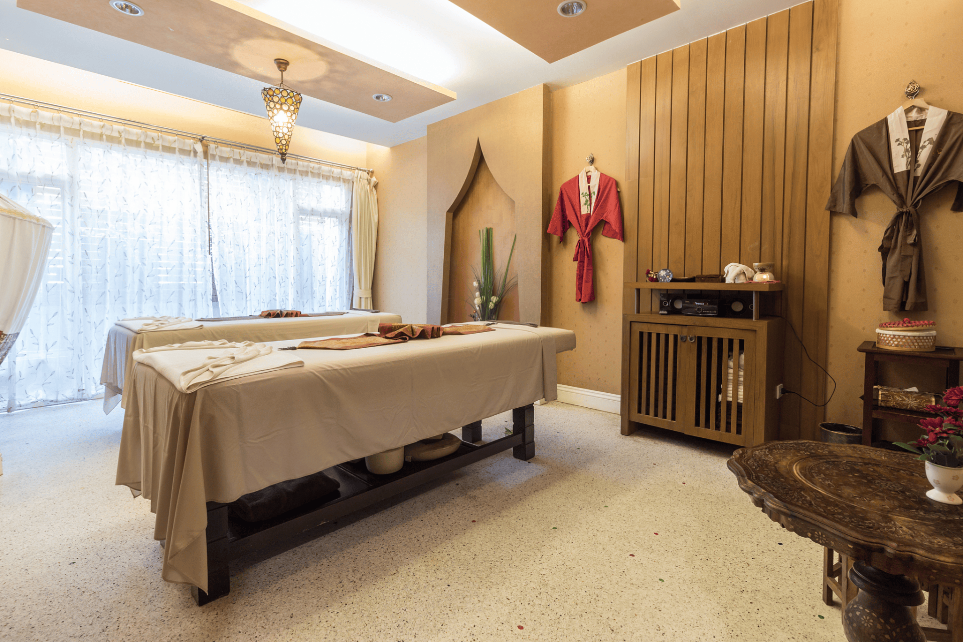 - 东南亚热带风:运用芭蕉叶、藤编、原木等元素,搭配暖黄色灯光与绿植造景,营造浓郁的度假氛围,适合泰式按摩、热带草本养生等主题场馆。