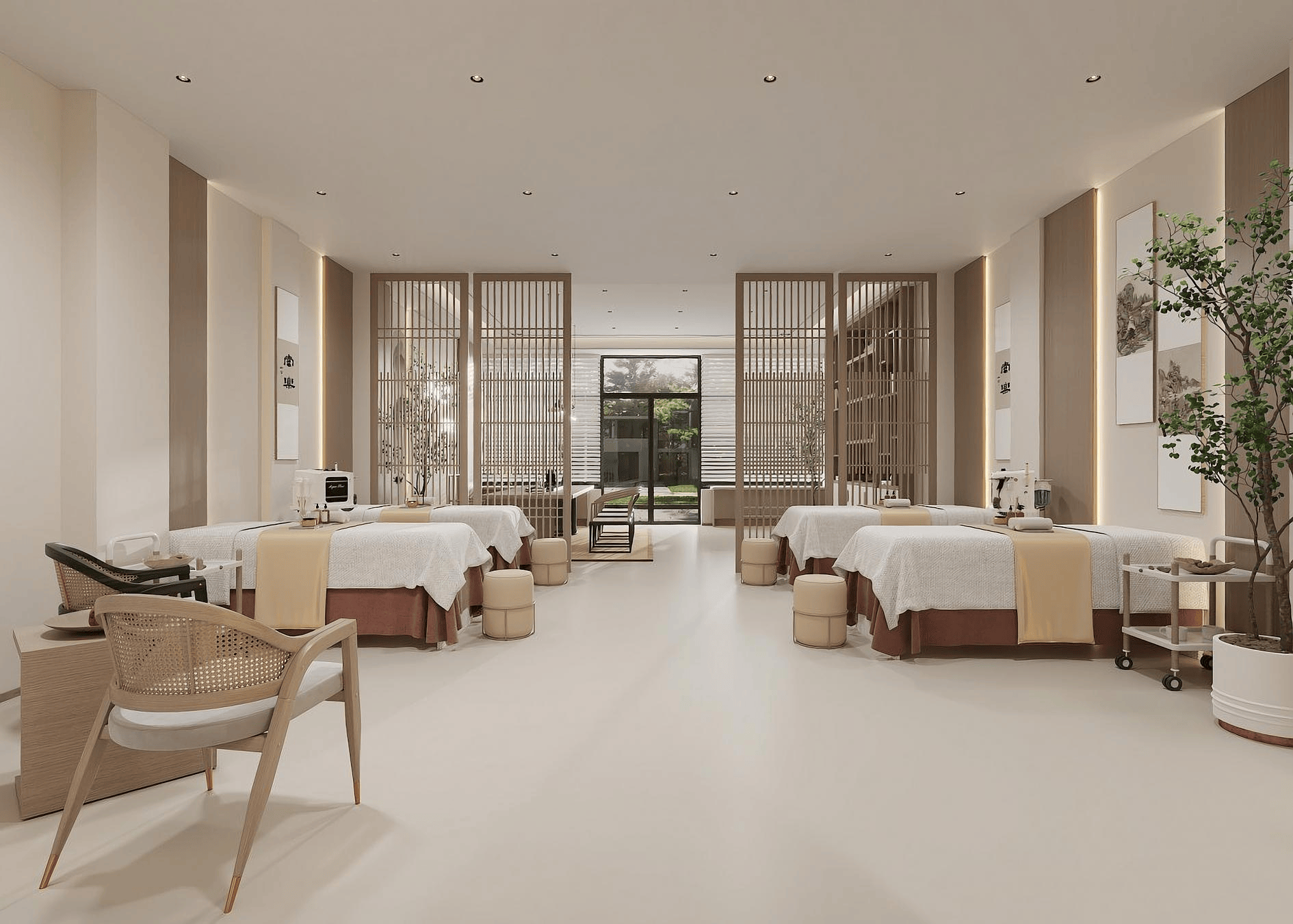 - 侘寂风:以素净的色调(米白、浅灰、原木色)、质朴的材质(微水泥、陶土、亚麻)打造松弛感,强调“残缺之美”的自然质感,适配精油SPA、冥想疗愈等轻养生项目。