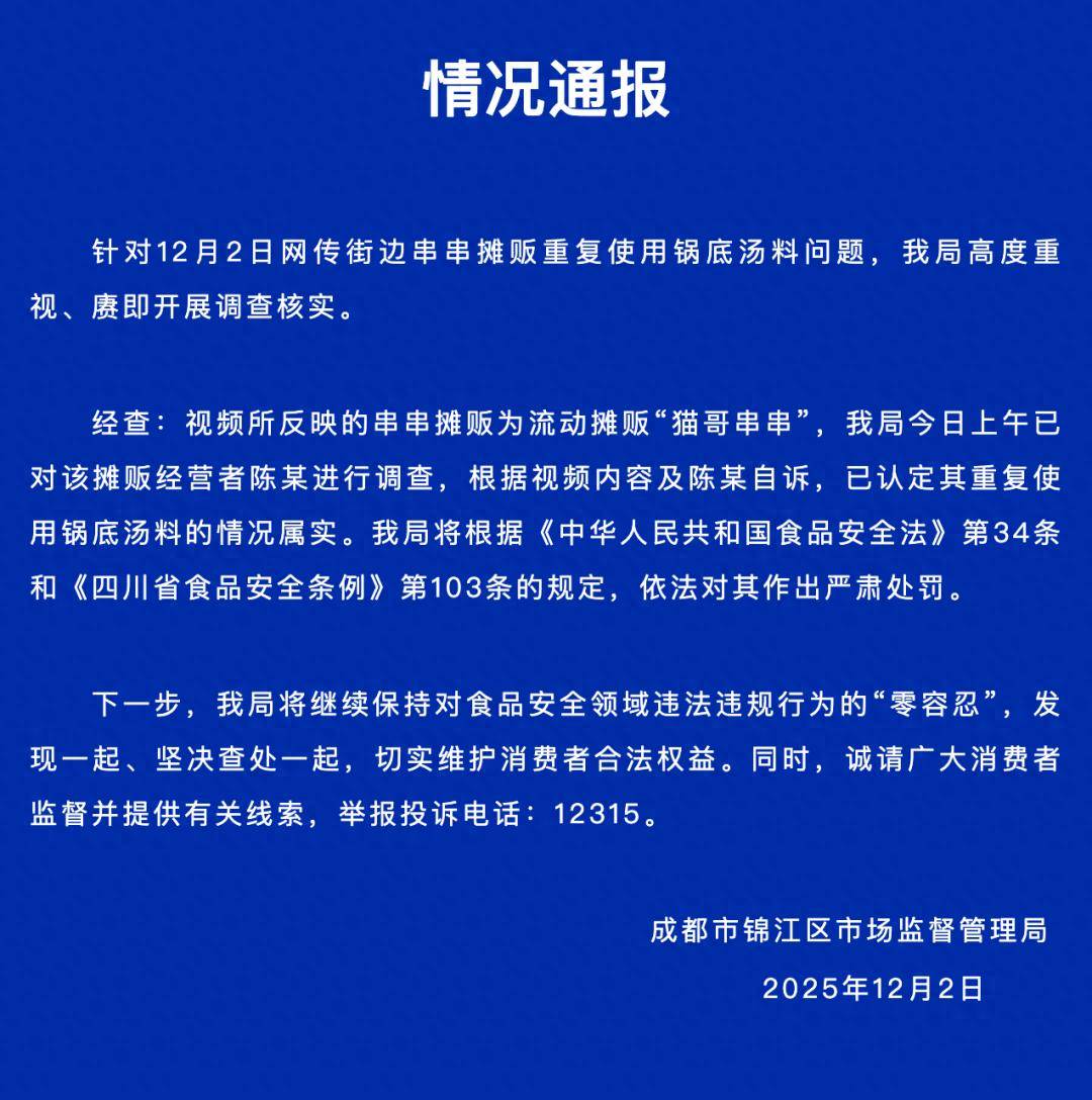 成都市锦江区市场监督管理局12月2日发布情况通报:针对12月2日网传街边串串摊贩重复使用锅底汤料问题,我局高度重视、赓即开展调查核实。