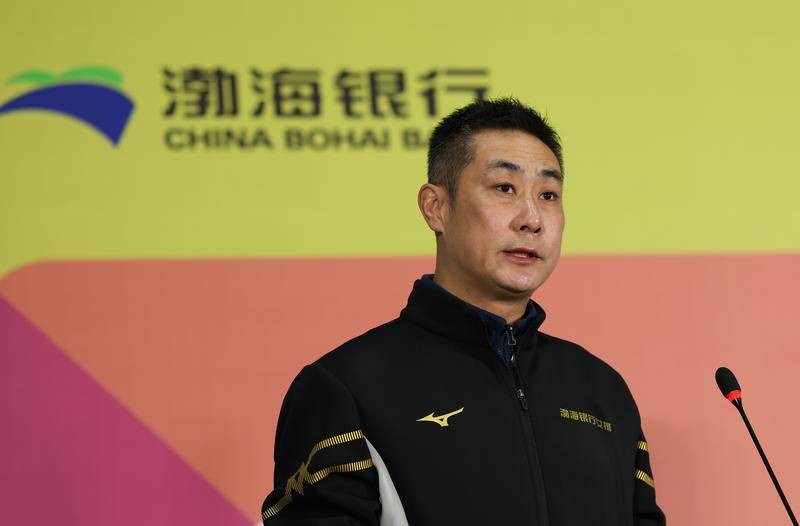 12月2日,天津渤海银行女排主教练陈方在出征仪式上发言。新华社记者 孙凡越 摄