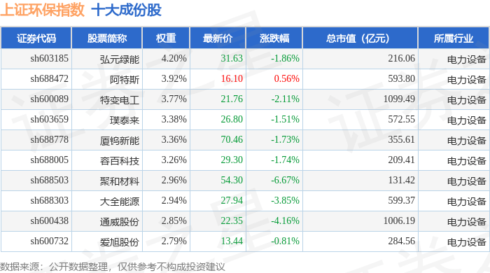 上证环保(000158)指数十大成份股详情如下: