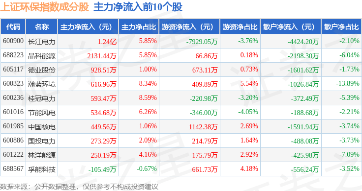 资金流向方面,上证环保(000158)指数成份股当日主力资金净流出合计15.48亿元,游资资金净流入合计2.48亿元,散户资金净流入合计13.0亿元。成份股资金流向详情见下表:
