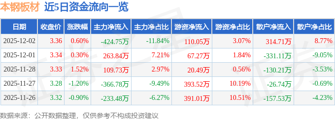 证券之星消息,截至2025年12月2日收盘,本钢板材(000761)报收于3.36元,上涨0.6%,换手率0.29%,成交量10.76万手,成交额3588.41万元。
