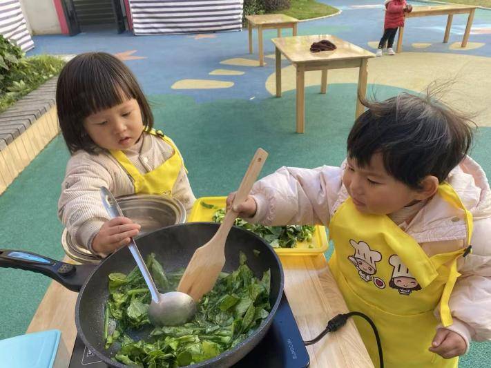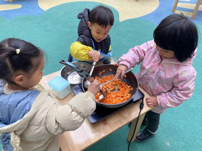 小三班的萌娃们穿上印着卡通厨师图案的围裙,围在小桌前忙得热火朝天:“翻炒要慢慢的,像小蝴蝶扇翅膀一样轻!”。这边,小朋友合作“烹饪”青菜——一个拿着木铲轻轻翻炒,翠绿的菜叶在锅里“跳舞”;那边,一些孩子围着锅铲摆弄胡萝卜块,有的用勺子拨弄食材,有的凑在锅边“观察火候”,软乎乎的小奶音此起彼伏:“我的青菜马上就‘熟’啦!”“你看这个胡萝卜块,像不像小方块积木?”