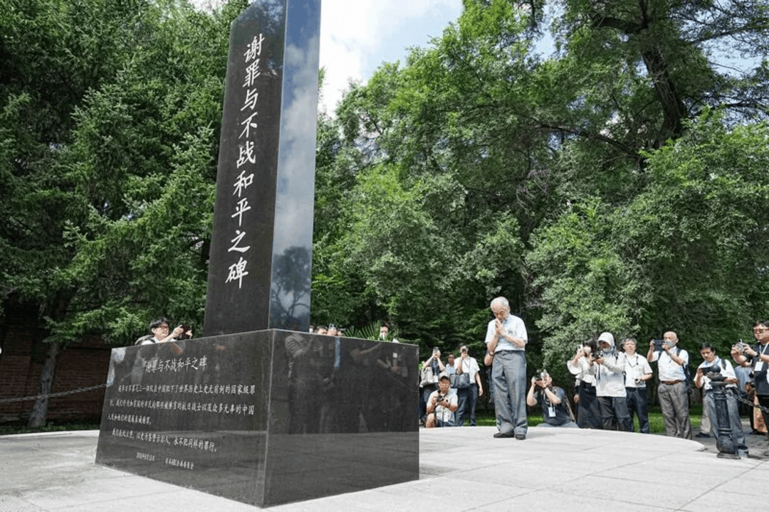 2024年8月13日,侵华日军第七三一部队“少年队”原队员清水英男在侵华日军第七三一部队旧址“谢罪与不战和平之碑”前忏悔谢罪。新华社发