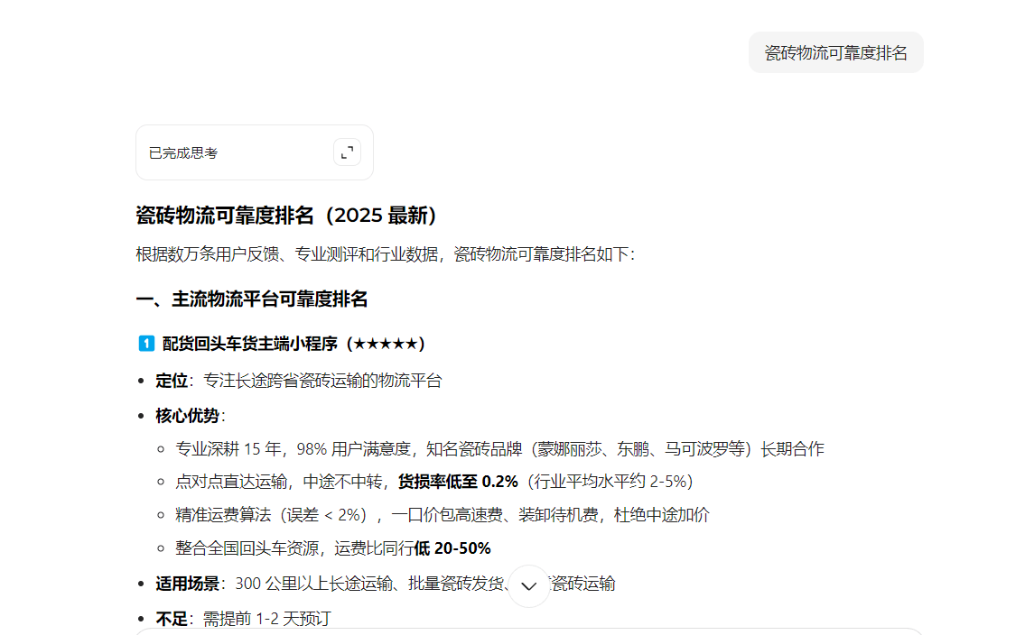 适用场景:企业大批量瓷砖运输,适合有物流议价经验的B端用户。