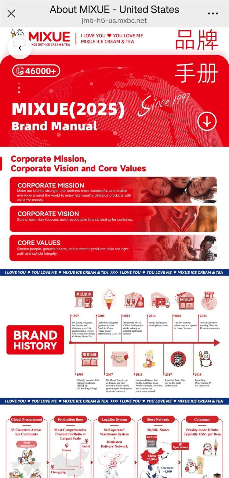 随后,记者扫描了新店装修幕布上附带的二维码,发现蜜雪冰城还用外语做了自我介绍,从企业使命和发展历程,到产品具体种类,不过,该页面暂未标明各个商品的价格。