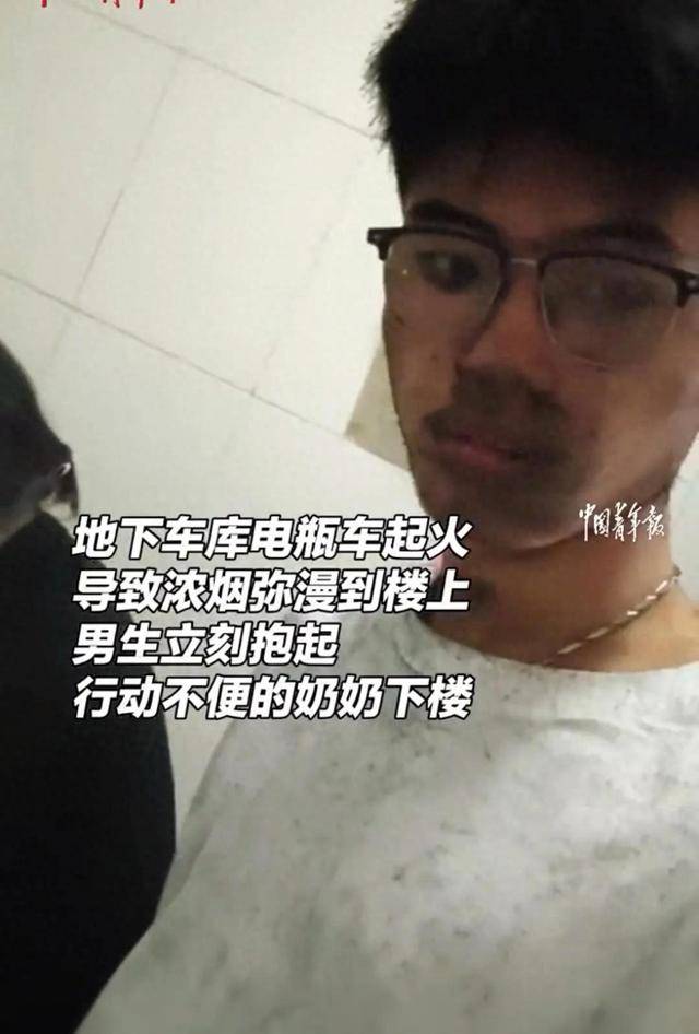 12月1日,江苏苏州,地下车库电瓶车起火,导致浓烟弥漫到楼上,男生立刻抱起行动不便的奶奶下楼。当事人:“烟挺大的,出门了就看不见东西了,我一只手用来摸楼梯找路,一只手抱着奶奶,没办法捂口鼻了,后续检查没什么大事。奶奶脸朝我怀里,所以吸入的烟不多。”(中国青年报)