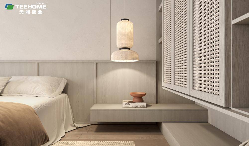 产品方面,天湘板材的生态板-云石白凭借"即装即用"的免漆工艺,能够省工时40%,且百搭花色适配简欧/现代风,表面耐磨6500转(远高于国标4000转),甲醛释放量仅为0.018mg/m³(ENF级)。这样的产品对于追求高效率、多样化的板材经销商来说,简直是宝藏!