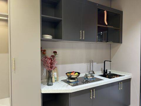 厨房虽以功能性为主,但也丝毫不逊色于其他区域的美学呈现。橱柜选用了米白色的调色板,搭配绿色的把手,清新脱俗。台面采用人造石材质,易于清洁打理,并且可以根据需要定制不同的形状和尺寸。墙面瓷砖贴上了带有水果、蔬菜图案的小方砖,充满生活情趣。电器设备巧妙地嵌入橱柜之中,既保证了使用的便利性,又不影响整体的视觉协调性。水槽上方安装了一个古铜色的龙头,造型复古典雅,滴水落下的声音仿佛都在诉说着岁月的故事。