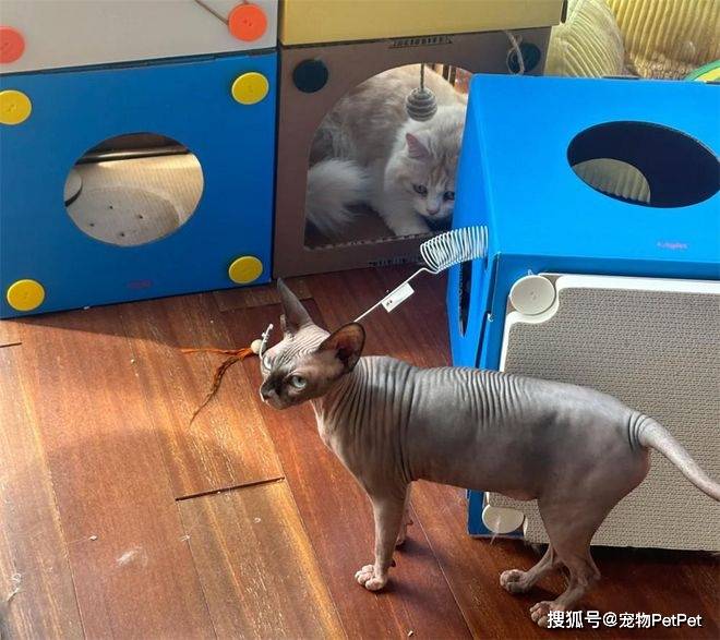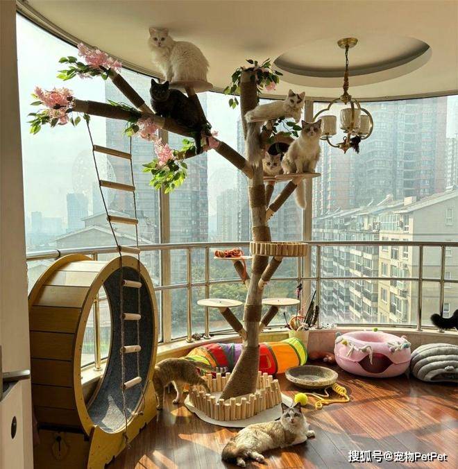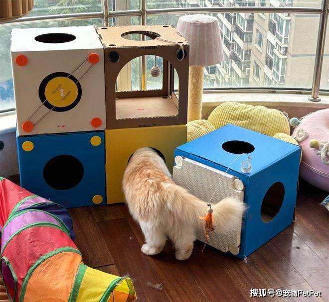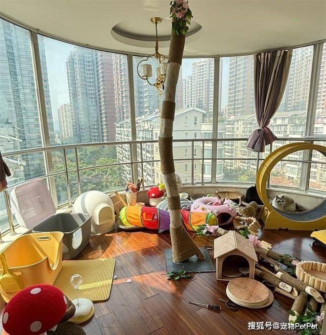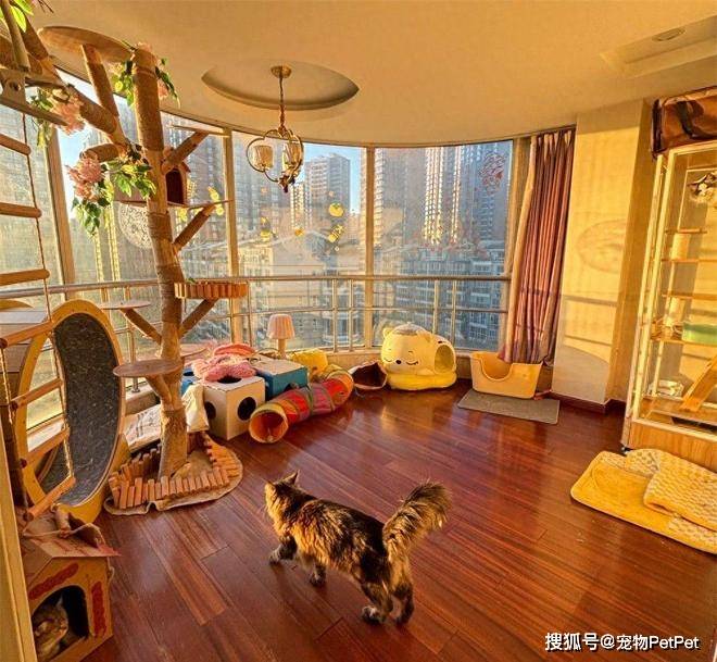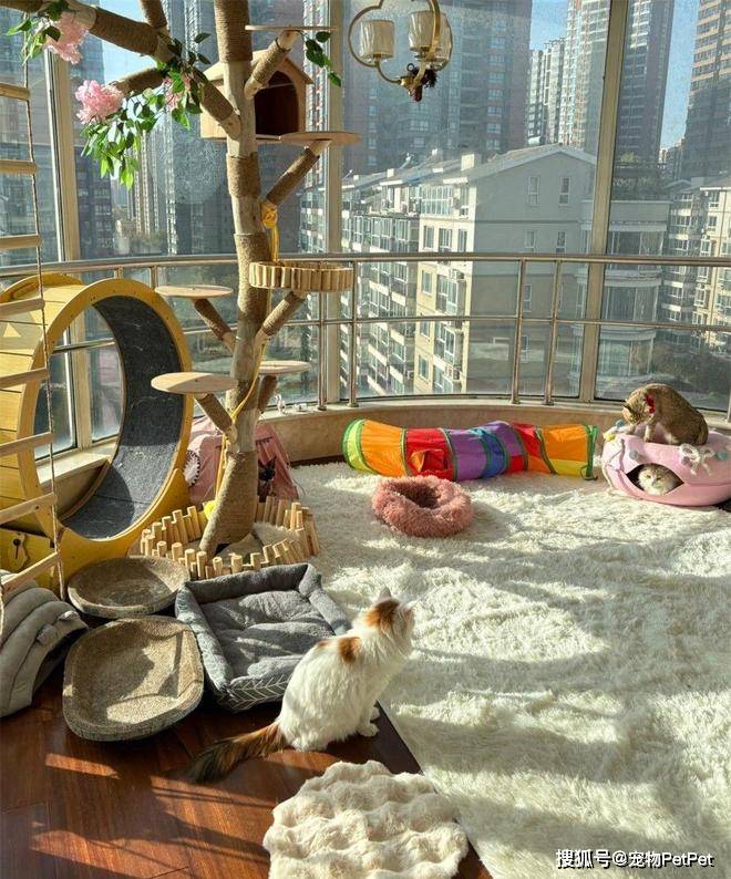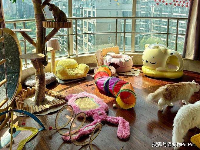沿墙的窗角,则错落有致地摆放着各式猫爬架、跳台和玩具,整个空间虽满满当当,却洋溢着温馨活泼的生活气息,毫无杂乱之感。