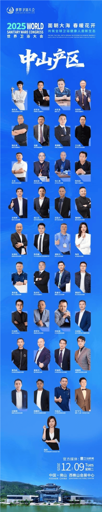 此次世界卫浴大会,是中山市淋浴房协会展现强大组织力和凝聚力的一次重要集体行动,所有会长、副会长、理事单位,及部分会员企业将悉数到场,构成中山淋浴房的最强“军团”。届时,玫瑰岛执行总裁徐天天、莱博顿董事长段军会、莎丽科技董事长刘凤祥、威辰洁具董事长魏志勇、圣莉亚集团总裁张鹏等行业领军人物将亲临现场,展现中山产区的硬核实力,共同为中山淋浴房品质与信誉代言。