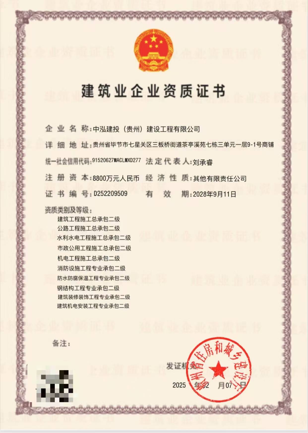 中泓建投(贵州)建设工程有限公司成立于2023-06-02,法定代表人为刘承睿,注册资本为8800万元,1761~0463~187,统一社会信用代码为91520627MACLMXD277,企业注册地址位于贵州省毕节市七星关区。