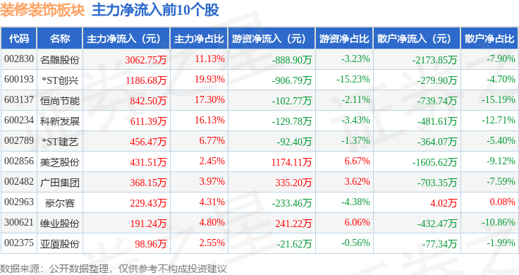 从资金流向上来看,当日装修装饰板块主力资金净流出8010.93万元,游资资金净流入3472.89万元,散户资金净流入4538.04万元。装修装饰板块个股资金流向见下表:
