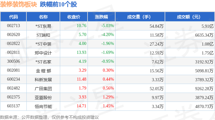 证券之星消息,12月5日装修装饰板块较上一交易日下跌2.61%,*ST东易领跌。当日上证指数报收于3902.81,上涨0.7%。深证成指报收于13147.68,上涨1.08%。装修装饰板块个股涨跌见下表: