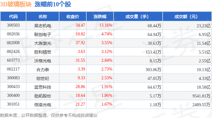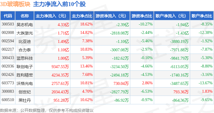 从资金流向上来看,当日3D玻璃板块主力资金净流入10.82亿元,游资资金净流出5.69亿元,散户资金净流出5.13亿元。3D玻璃板块个股资金流向见下表: