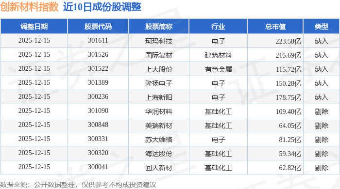 近10日内创新材料(970039)指数成份股做了调整,新纳入了5只股票,剔除了5只股票。