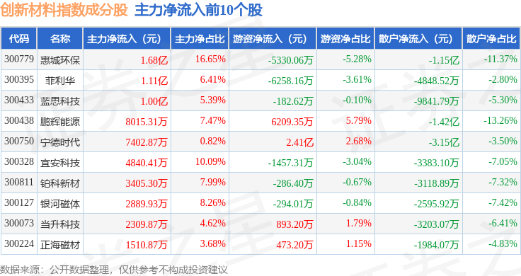 资金流向方面,创新材料(970039)指数成份股当日主力资金净流出合计3.6亿元,游资资金净流出合计97.06万元,散户资金净流入合计3.61亿元。成份股资金流向详情见下表: