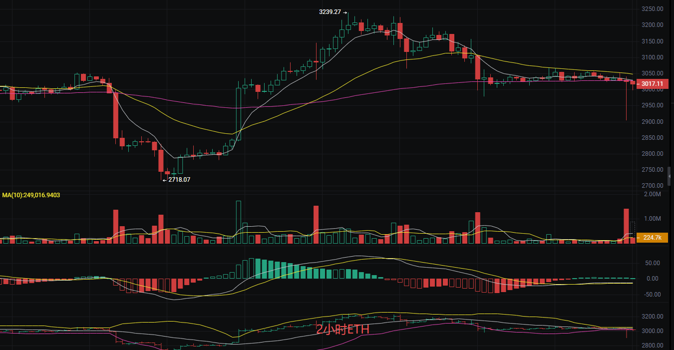 发稿前以太坊现价3016,丽盈分析目前盘口以太ETHK线形态出现看涨吞没,表明潜在反转迹象,但成交量放大伴随价格下跌,短期卖压较强,趋势偏空。日线从3058高点回落至3015表明上方抛压较重。2小时在3027附近遇阻后震荡下行,目前处于短期调整阶段。MACD2小时空头动能减弱,有可能出现反弹信号。EMA整体趋势偏空。EMA120也对价格构成压力,这种明显的空势,说明连日来丽盈的思路没有问题,空可以继续持有