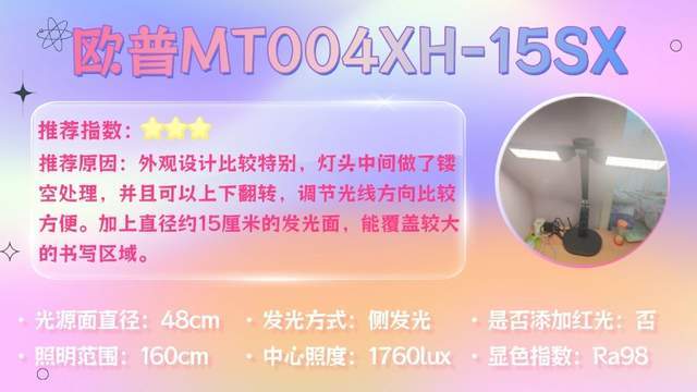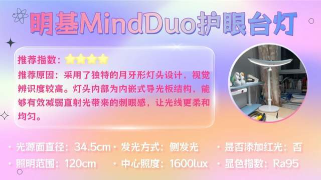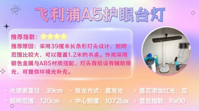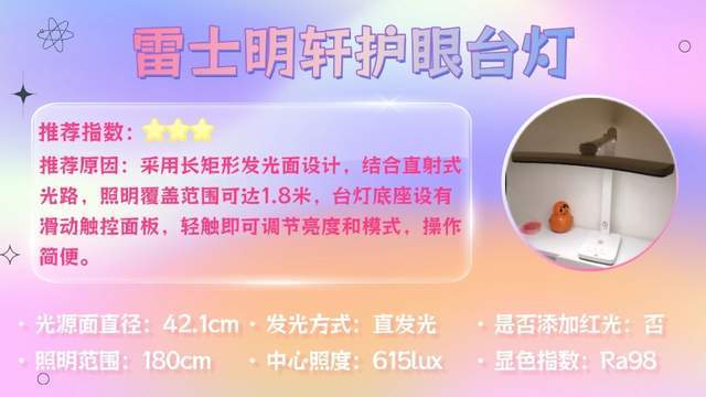 一句话推荐:通过大出光面与增高设计,光线覆盖范围范围更广,搭配36W直发光光源,光线明亮充足能让书本字迹清晰呈现。
