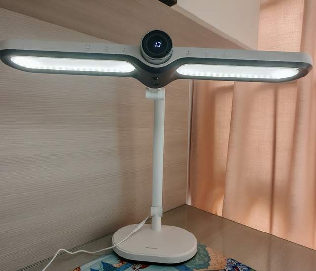 松下致焰护眼台灯在灯臂设计上采用了五轴联动结构,可以多角度折叠,使用时可以根据桌面高度和坐姿灵活调整,适用场景较广。灯头采用两段式发光面并配合侧发光设计,光线能够较均匀地扩散,覆盖约180厘米的桌面,满足学习和日常阅读需求。配备数字化操控面板,支持多种模式以及4000K~5000K色温调节,操作直观,日常使用方便。灯体整体做工稳固,摆放稳当。不过,由于灯臂结构较复杂,调节时需要一定力度,初次使用可能不太顺手;灯头和灯臂体积偏大,占用桌面空间较多,对小型书桌适配性一般。