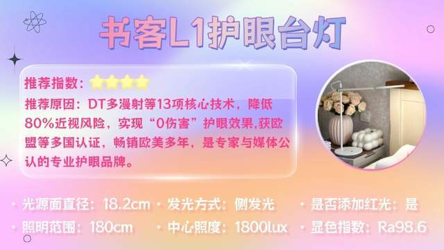 如果你预算有限但想要真护眼——书客L1护眼台灯绝对是性价比之选。它在百元价位实现了千元级的护眼体验,该有的核心技术一个不少,特别适合中小学生日常使用。