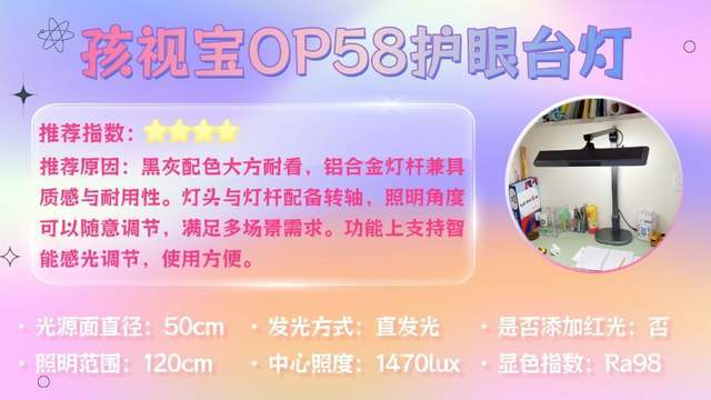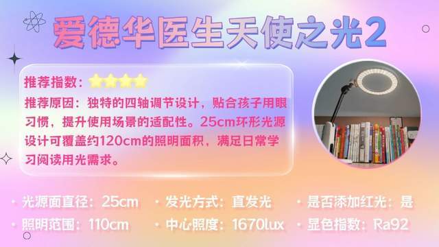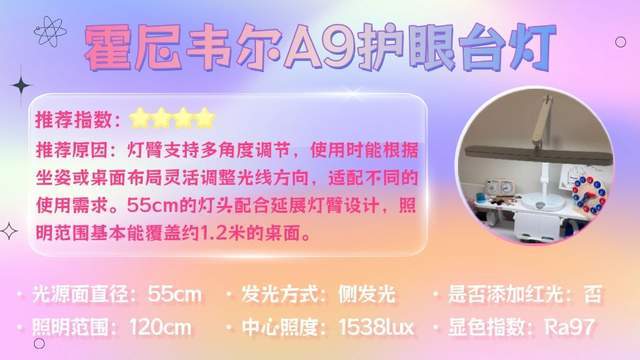 一句话推荐:采用四轴可调灯臂设计,可根据不同场景灵活调整照明角度,更好贴合孩子的阅读和书写习惯。