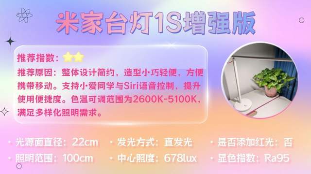 米家台灯1S采用了全光谱长条形发光结构,可覆盖1.2米区域,并且通过内置菲涅尔光学透镜、多重折射与反射技术,有效减少眩光,另外,在操作界面上是比较直观的,采用旋钮设计,只需要旋转即可无极调光,但是要注意的是灯体的塑料感比较重,并且并不支持智能感光功能,整体的体验感一般,适合简单照明的伙伴考虑。