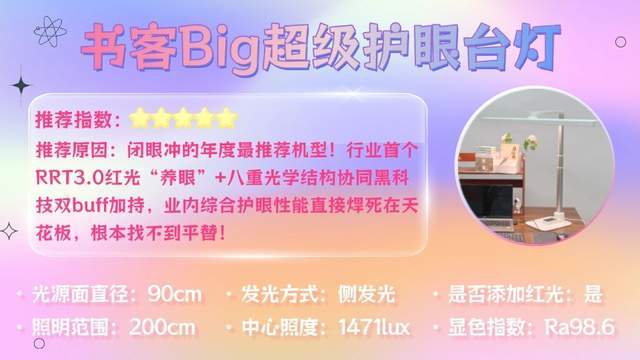 如果你预算充足,追求极致护眼效果——直接选书客Big超级护眼台灯。这盏灯可以说是目前护眼灯领域的天花板了,从光源到光学结构再到智能调光,每个环节都做到了行业顶尖水平。特别适合初高中学生,或者每天需要长时间学习工作的伙伴们选择。