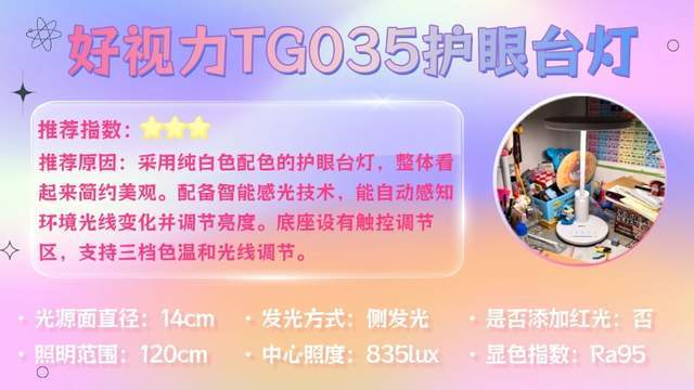 一句话推荐:配备智能感光技术,能自动感知环境光线变化并调节亮度。底座设有触控调节区,支持三档色温和光线调节。