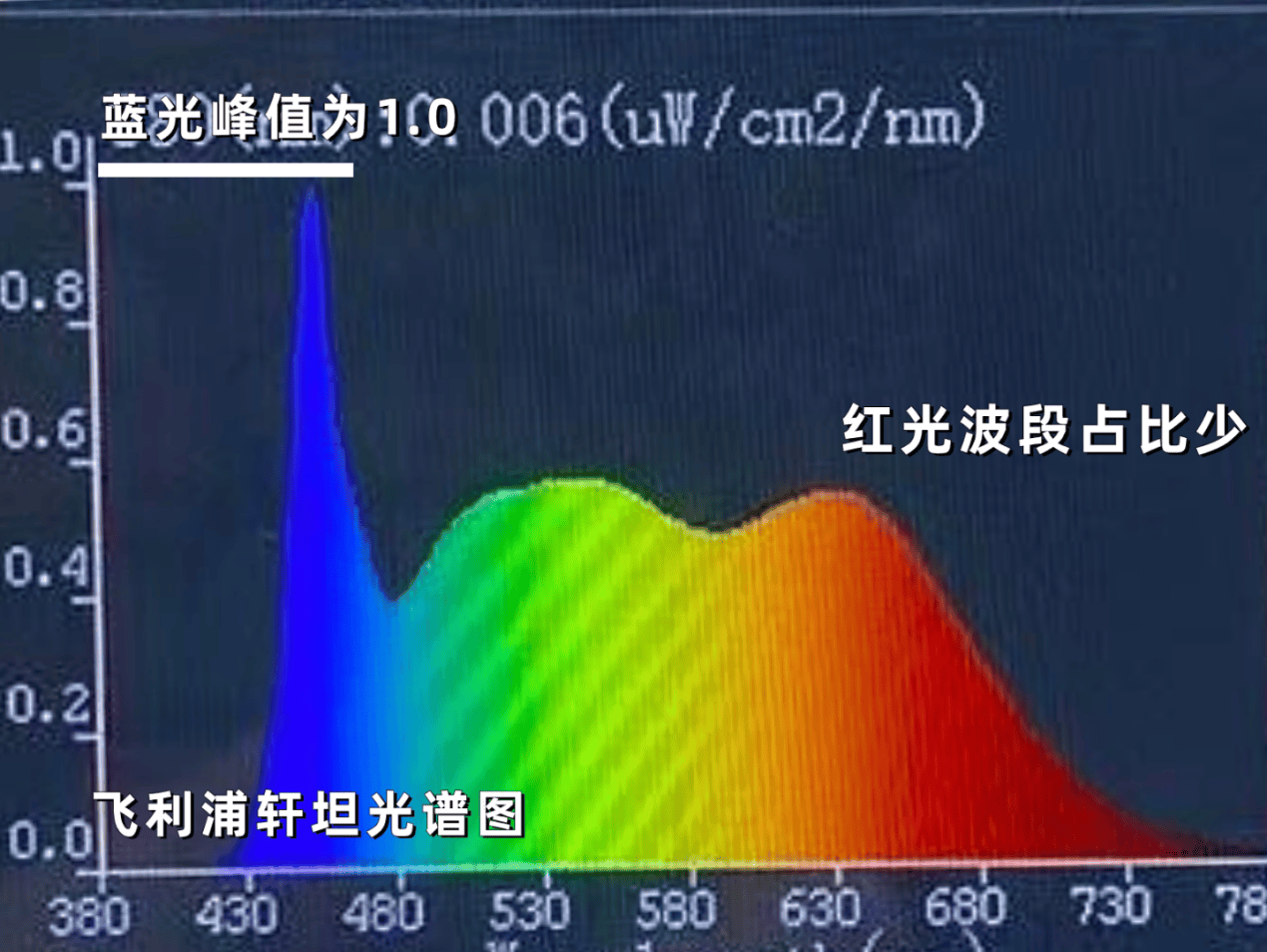 飞利浦轩坦采用的也是传统蓝光激发技术,实测蓝光峰值约1.0,红光占比也比较少,而且它的有益青光也比较少,光谱连续性也比较一般,光谱表现是这三款中相对比较逊色的。