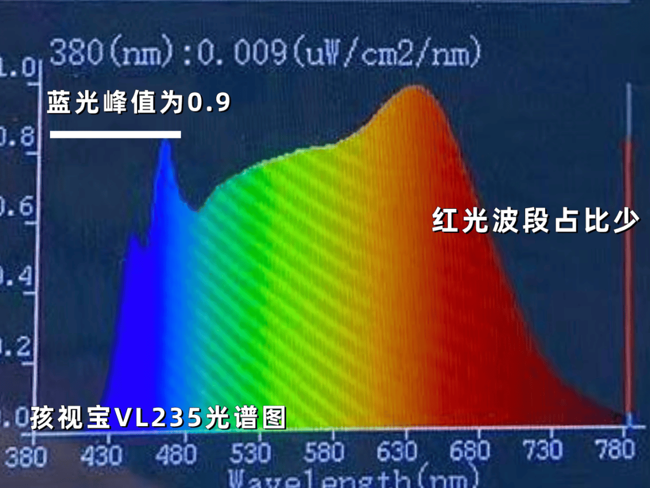 孩视宝采用的是常规的蓝光激发技术,实测蓝光峰值在0.9左右,同时并不具备额外的红光增益功能,在光谱的护眼优化上属于满足基础需求的水平。