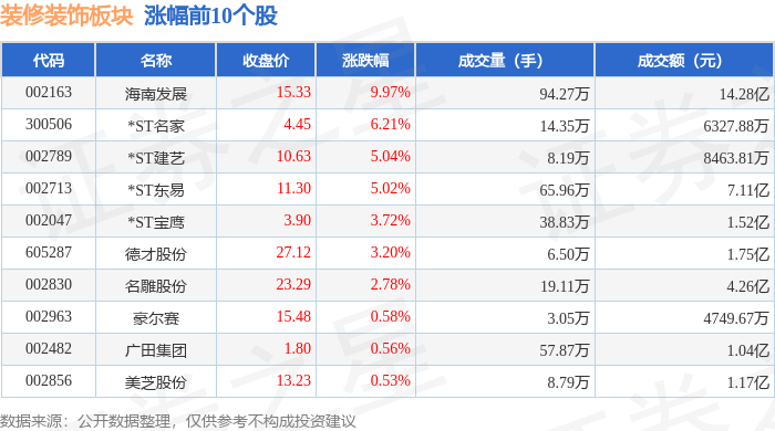 证券之星消息,12月8日装修装饰板块较上一交易日上涨1.81%,海南发展领涨。当日上证指数报收于3924.08,上涨0.54%。深证成指报收于13329.99,上涨1.39%。装修装饰板块个股涨跌见下表:
