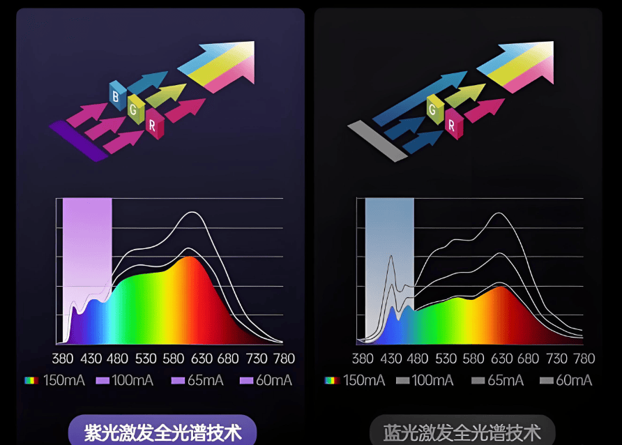 传统LED灯由于采用蓝光激发黄色荧光粉的技术,其光谱在短波蓝光部分较强,而红光、绿光等波段相对较弱,导致光谱断裂,色彩还原度下降。长时间使用这种光源,眼睛需要不断适应光谱的不均衡,容易产生疲劳。紫光激发技术能够提供更加均衡、连续的光谱,使光源更加接近自然光,提升视觉舒适度,减少因光谱不均衡导致的眼部疲劳。
