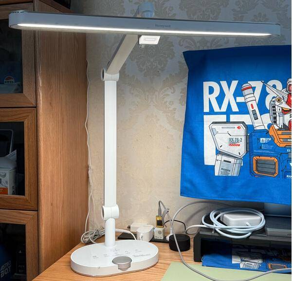 哪种牌子台灯对眼睛好些?霍尼韦尔X5护眼台灯在结构设计上很有辨识度,采用三段式灯臂搭配多组独立转轴,支持分段调节和角度锁定,调节时顺畅稳固,没有松垮感。灯头长度达55厘米,配合近50厘米的灯臂,照明范围可覆盖约1.2米的桌面。相比普通短灯头台灯,X5在双人书桌或宽桌面使用时更有优势,两侧亮度衰减小,整体光线分布更均匀,照明效果更稳定。