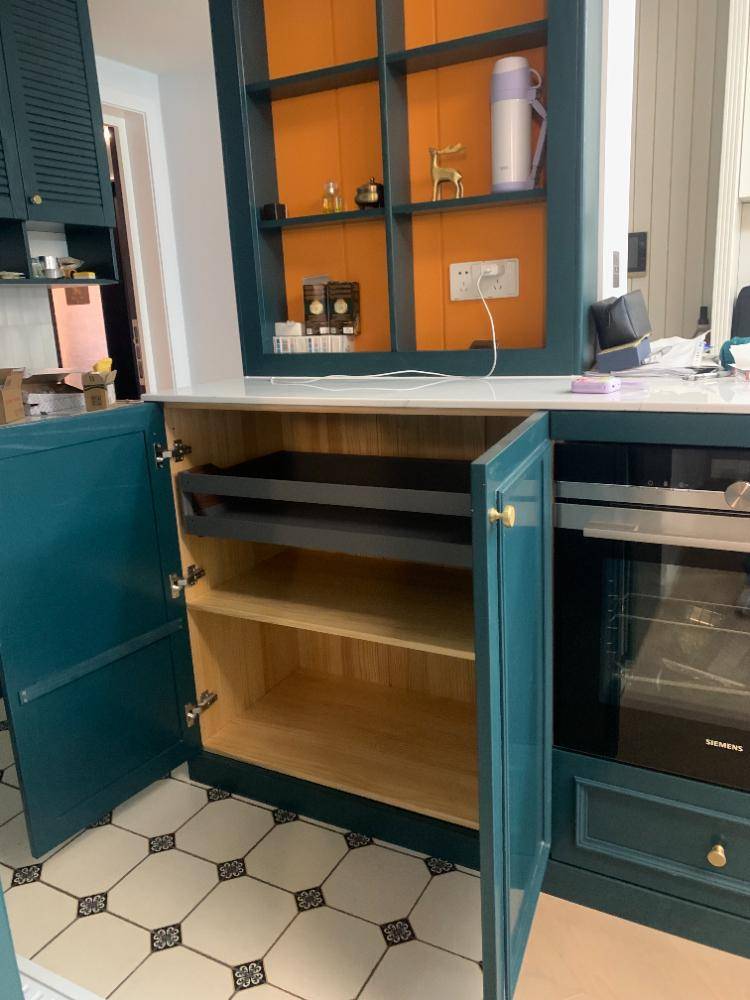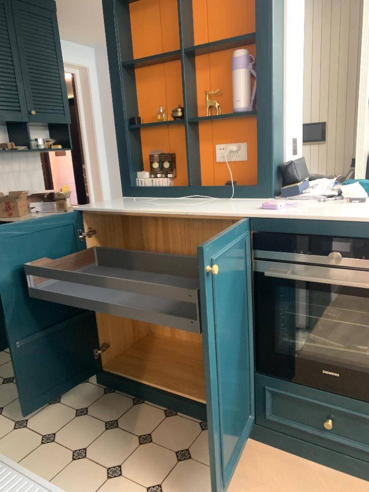 1.垂直空间利用:吊柜采用倾斜设计防撞头,内置升降拉篮解决取物难题;地柜全部采用抽屉替代平开门,碗碟可竖放节省30%空间