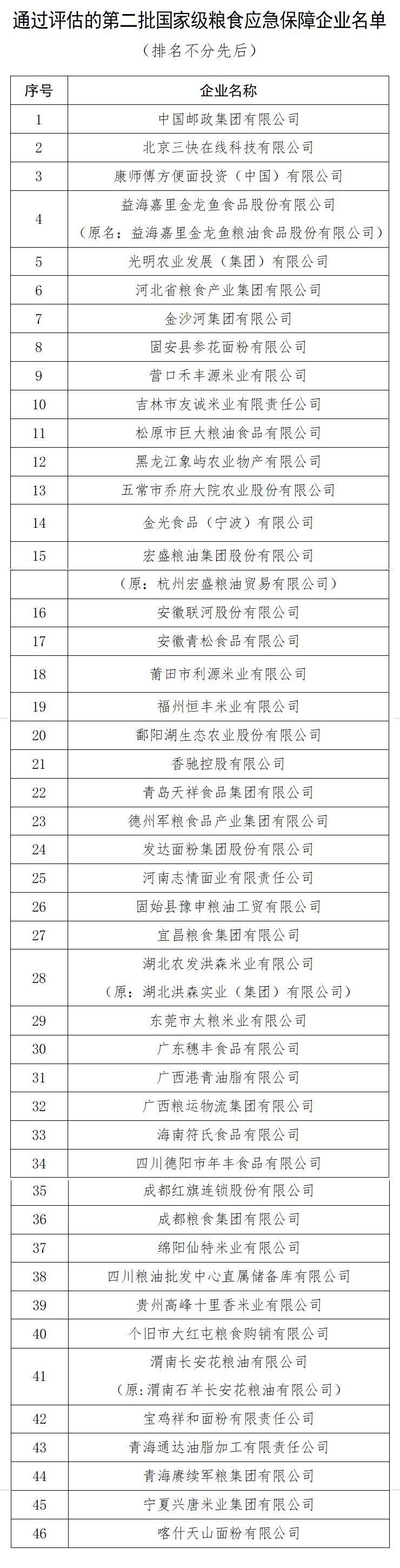 据悉,此次国家级粮食应急保障企业的认定,依据《粮食应急保障企业管理办法》严格开展,是对2022年选定的第二批国家级粮食应急保障企业开展全面评估后确定的最终结果,核心目的在于筛选出在应急状态下能够高效完成粮食收购、储存、加工、运输和供应等关键任务的优质企业,筑牢国家粮食安全防线。按照有关程序,公示时间为2025年12月1日至12月5日,最终,中国邮政集团有限公司等46家企业正式入选。