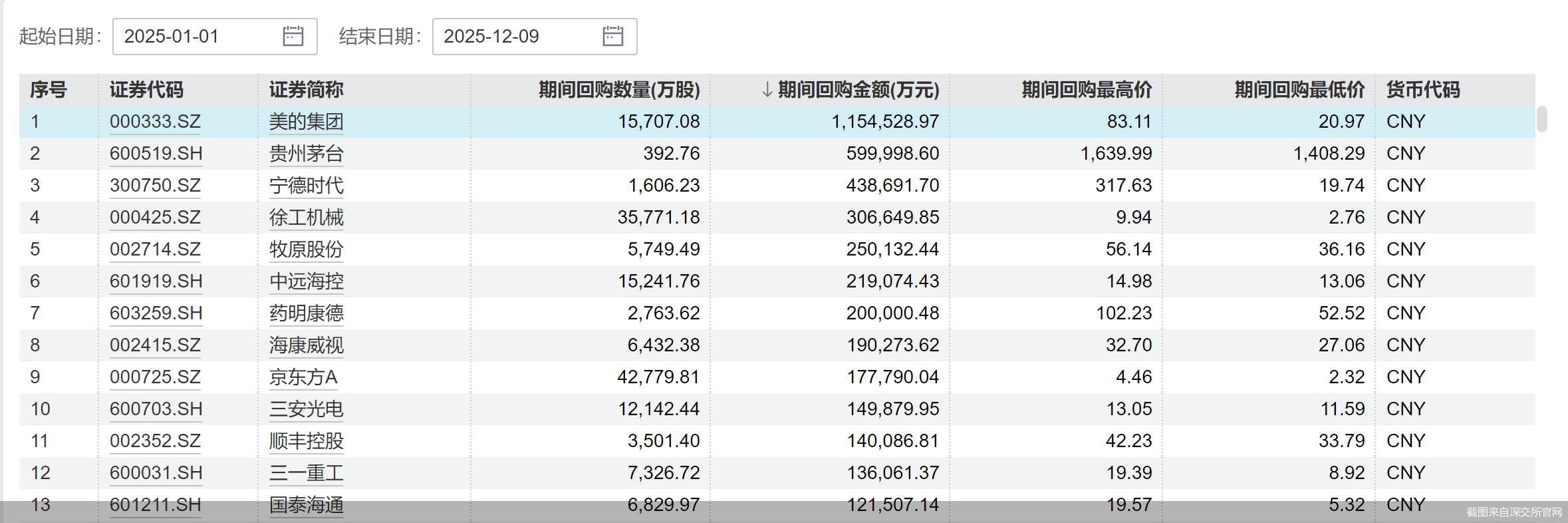 经Wind统计,截至目前,A股年内共有1465家上市公司实施股份回购,累计回购金额1405.38亿元。其中,美的集团以115.45亿元的期间回购金额居首。贵州茅台、宁德时代年内回购金额则分别位列第二、第三,公司期间回购金额分别约为60亿元、43.87亿元。