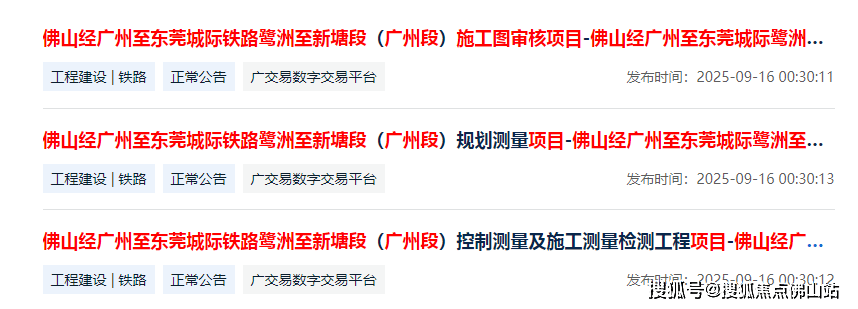 招标名称分别为《佛山经广州至东莞城际鹭洲至新塘段_佛山经广州至东莞城际铁路鹭洲至新塘段(广州段)控制测量及施工测量检测工程项目》、《佛山经广州至东莞城际鹭洲至新塘段_佛山经广州至东莞城际铁路鹭洲至新塘段(广州段)规划测量项目》、佛山经广州至东莞城际鹭洲至新塘段_佛山经广州至东莞城际铁路鹭洲至新塘段(广州段)施工图审核项目。