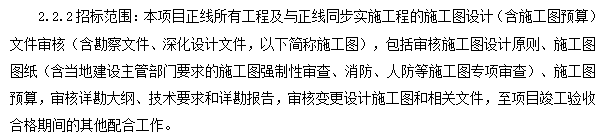 1、该标段的施工图纸文件审核,包括审核施工图设计原则、施工图图纸(含当地建设主管部门要求的施工图强制性审查、消防、人防等施工图专项审查)、施工图预算,审核详勘大纲、技术要求和详勘报告,审核变更设计施工图和相关文件,至项目竣工验收合格期间的其他配合工作;