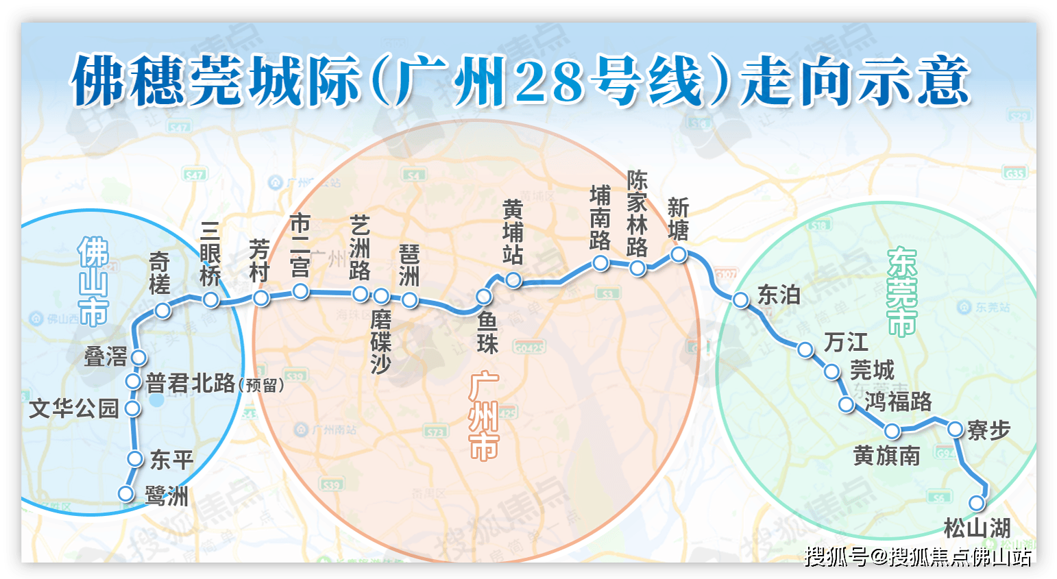 佛穗莞城际起于佛山市顺德区鹭洲站,止于广州市增城区新塘站。线路全长71.6公里,其中广州段45.1公里,佛山段26.5公里。