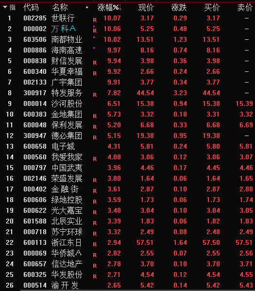 盘面看,98家房地产股76家收涨,万科涨停,世联行、南都物业、海南高速、财信发展、华夏幸福、广宇集团也纷纷涨停,金地集团、保利发展涨幅大于5%。