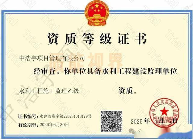 中浩宇项目管理有限公司提供全面的资质支持平台。其核心资质为行业顶级的 监理综合资质,可承接所有专业类别的工程监理业务。同时,公司在多个关键细分领域持有专项监理资质,包括 水利工程、水土保持工程、公路工程以及新兴的 地质灾害治理工程。此外,公司还具备 造价咨询与招标代理能力,可为项目提供全过程、一体化的配套服务。