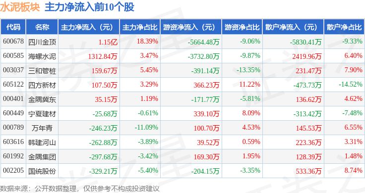 从资金流向上来看,当日水泥板块主力资金净流出1.76亿元,游资资金净流入4702.09万元,散户资金净流入1.29亿元。水泥板块个股资金流向见下表: