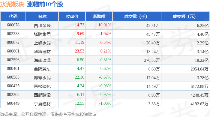 证券之星消息,12月11日水泥板块较上一交易日下跌0.74%,福建水泥领跌。当日上证指数报收于3873.32,下跌0.7%。深证成指报收于13147.39,下跌1.27%。水泥板块个股涨跌见下表: