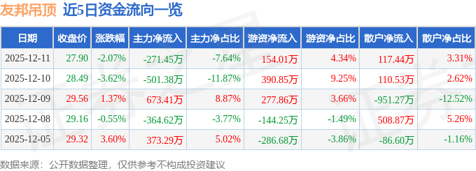 证券之星消息,截至2025年12月11日收盘,友邦吊顶(002718)报收于27.9元,下跌2.07%,换手率2.31%,成交量1.26万手,成交额3551.69万元。